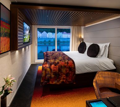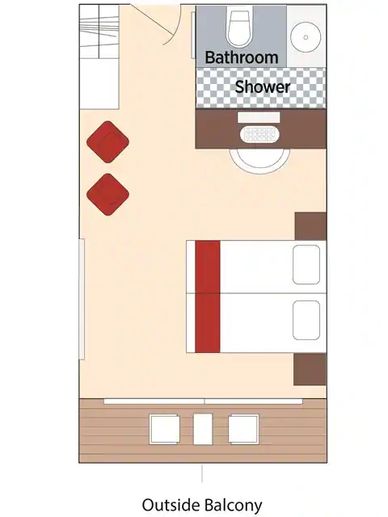 A spacious cabin at 252 sq.ft. with a step-out balcony. Features a sleek, modern design style that combines contemporary elegance with luxurious comfort. The incorporation of darker wood tones adds an element of richness and warmth to the interior decor.